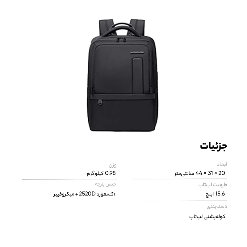 به طور کلی این کوله دارای محفظه‌ای مخصوص برای لپ‌تاپ‌های تا سایز ۱۵٫۶ اینچ، جیب‌های سازمان‌دهی‌شده برای لوازم کوچک و طراحی ارگونومیک بندهای شانه است. مواد مقاوم در برابر آب از جنس پلی‌استر و بخش‌های دارای پد برای حفاظت از تجهیزات الکترونیکی و کاهش فشار بر شانه و کمر از دیگر ویژگی‌های مهم این کوله هستند. در نتیجه با این کوله پشتی استاندارد و حرفه‌ای می‌توانید بدون خسته شدن، یا حتی حس کردن سنگینی و ناراحتی بر شانه‌ها، مسیر زیادی را طی کنید.